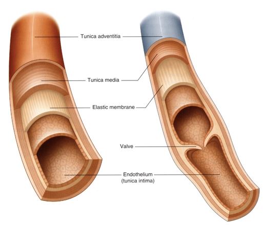 The arterial and venous walls have an inner, middle, and outer elastic membrane (tunica). One of the functions of the elastic tissue is to absorb and store the vascular energy created by the moving blood. Proprioception and protection against stretching forces are other major functions of the elastic membranes. Arteries and veins are innervated by the sympathics of the ANS and receive both motor and sensory innervations.